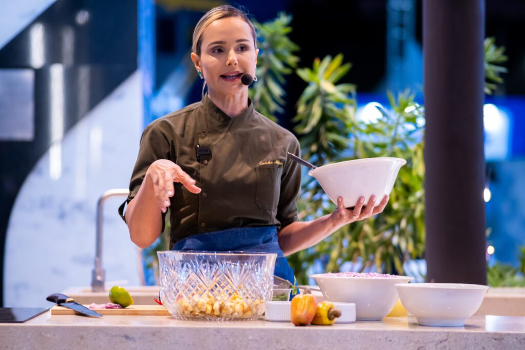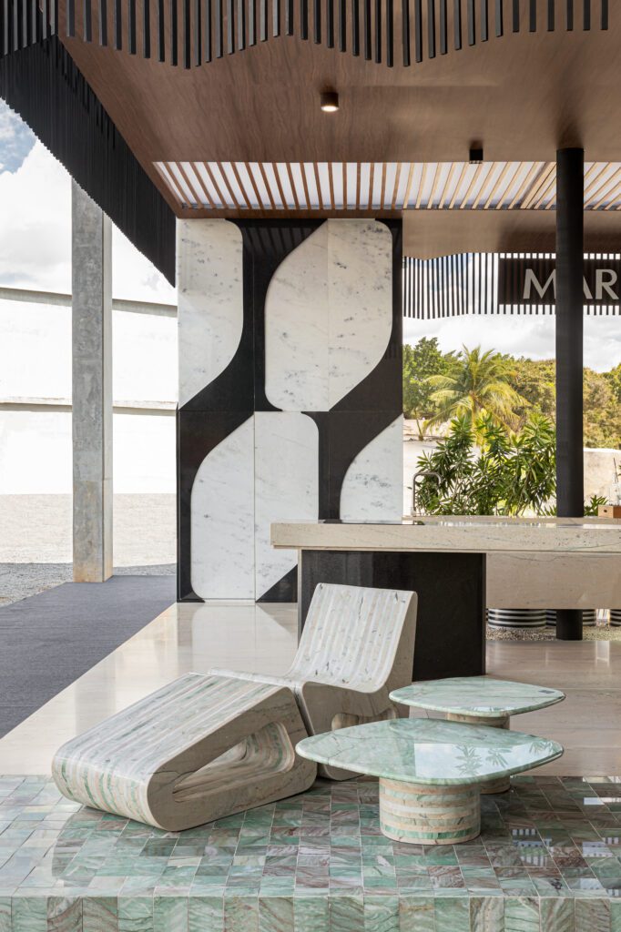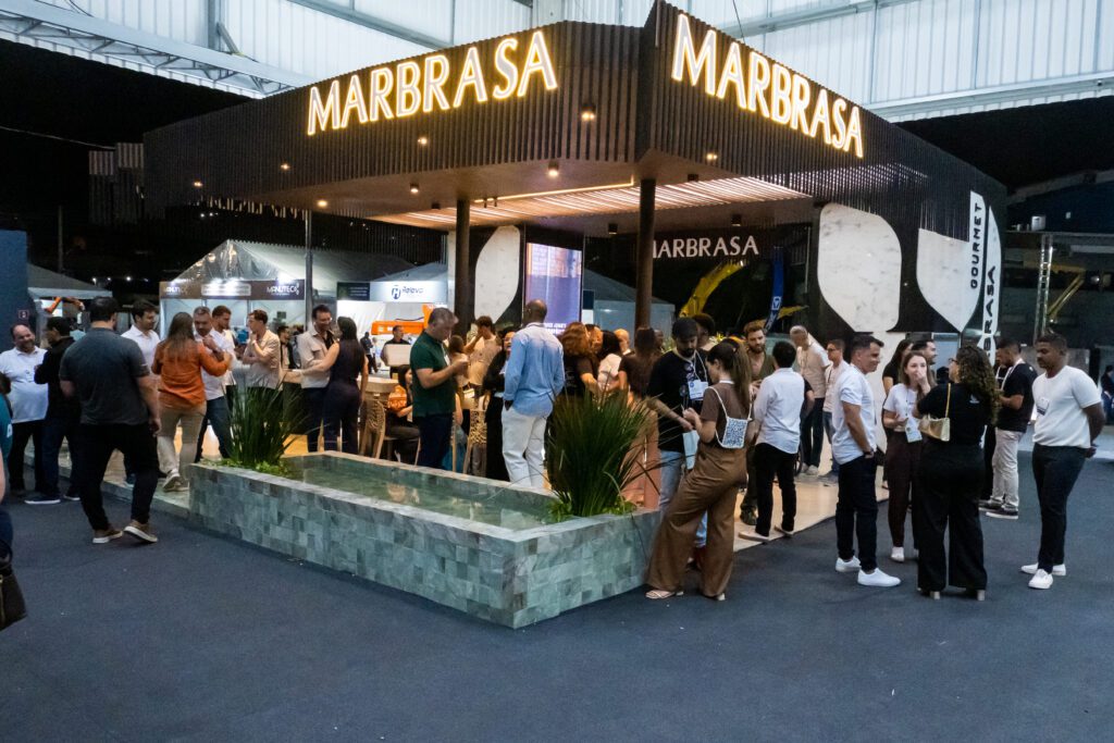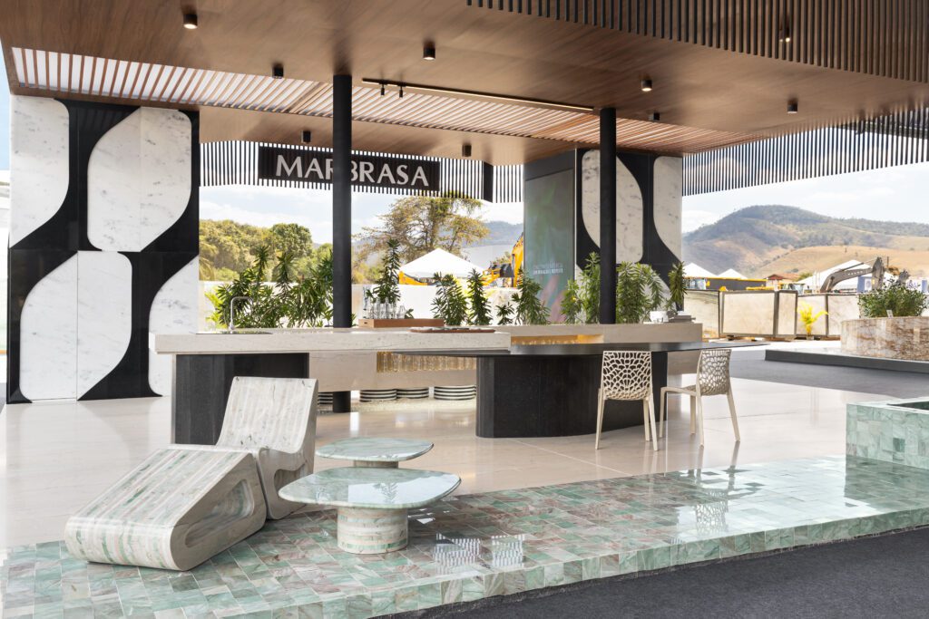 Nosso stand, inspirado na essência da arquitetura tropical brasileira, convidou os visitantes a mergulhar em um ambiente que celebra a vida ao ar livre, a natureza e, acima de tudo, os encontros. Batizado de Marbrasa Gourmet, o projeto trouxe uma cozinha integrada à área da piscina, criando um espaço acolhedor, pensado para receber bem, compartilhar sabores, histórias e boas conversas. Cada detalhe refletia o espírito brasileiro, vibrante, afetivo e generoso, aliado à sofisticação do design e à beleza natural das rochas.